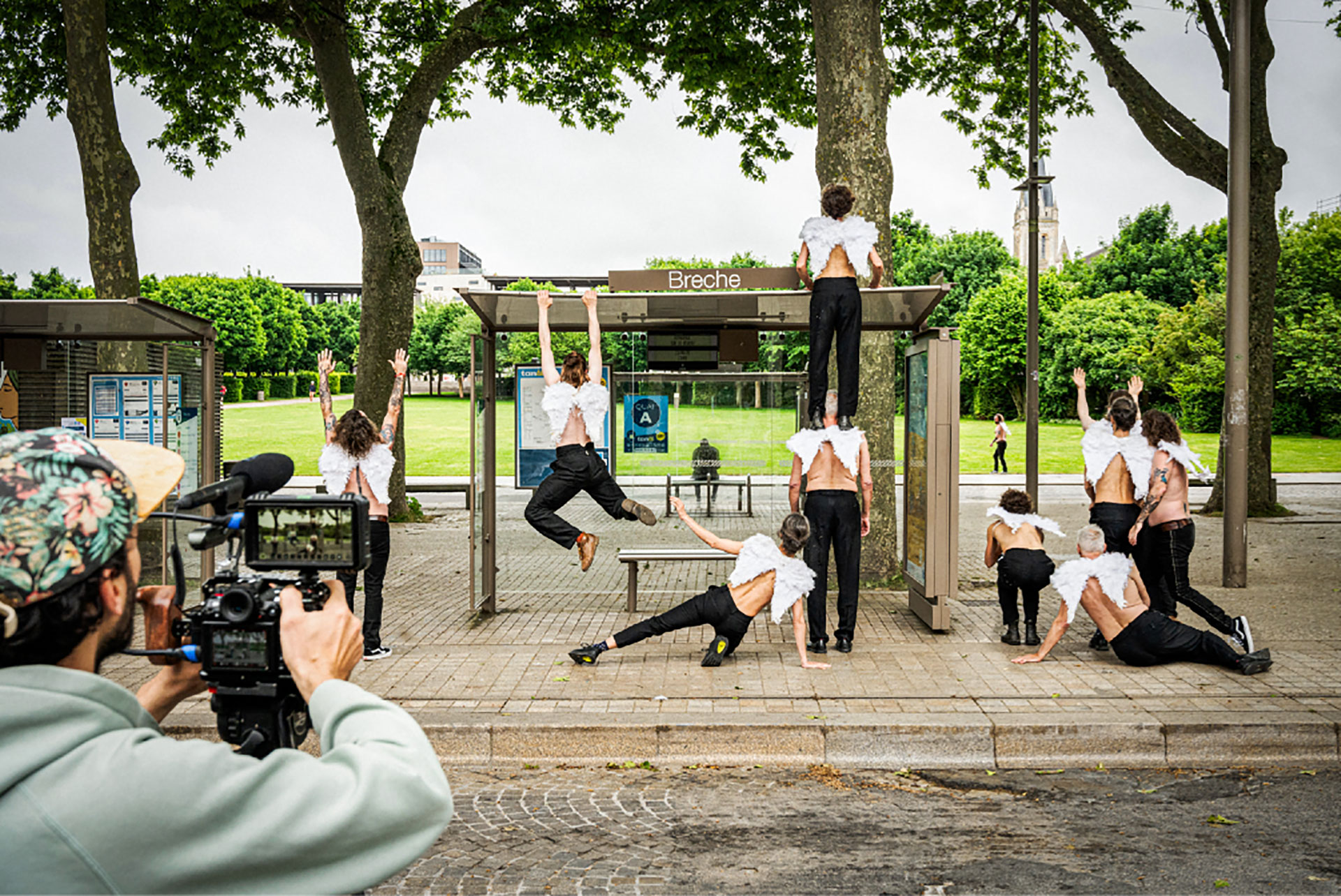 Nous avons ainsi réalisé 3 tournages d’une semaine dans 3 villes différentes à St Médard et à Blanquefort (Scène Nationale Carré-Colonnes) puis à Cognac (Festival Planète Danse/ Théâtre de l!AvantScène) Télérama avait eu le temps d’écrire un article: « Des moutons attendent un train qui n’arrivera jamais. Des anges sortent des poubelles. La ville marche à l’envers. Entre l’univers de Jacques Tati et celui de Win Wenders, ces partitions chorégraphiques loufoques et poétiques sont écrites pour et avec les espaces ur bains dans lesquels elles se jouent. S’insérant dans le flux de la ville, amenant la danse là où elle n’est pas, elles nous invitent à regarder autrement nos quotidiennes habitudes… »